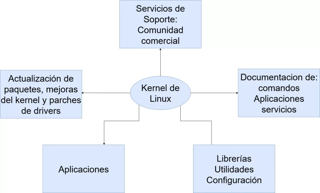 Regresemos al tema de las distribuciones de Linux. ¿Qué es una distribución de Linux y qué relación tiene con el kernel? Como ya diimos antes, el kernel es el núcleo del sistema operativo. Una distribución de Linux consiste en el kernel más otras herramientas, por ejemplo una distribución puede añadir herramientas para manejo de archivos, gestión de usuarios y manejo de paquetes de software. Cada una de estas herramientas provee una parte del sistema completo y a menudo cada una de estas herramientas es su propio proyecto con sus desarrolladores propios trabajando en esa parte concreta del sistema.